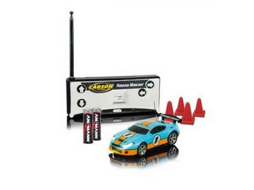 The manoeuvrable CARSON RC NANO RACER are the racing cars for tight spaces. The mini cars are controlled by the MHz 2-channel remote control, which also serves as a charging station and for storage. For the transmitter high-quality mignon batteries are included. The racers have full driving function and are equipped with LED lighting front and rear. Make your table a racetrack and deliver exciting races in the tightest of spaces. Thanks to 100% complete delivery, the CARSON NANO RACERS are ready to go. Buy, load – drive!